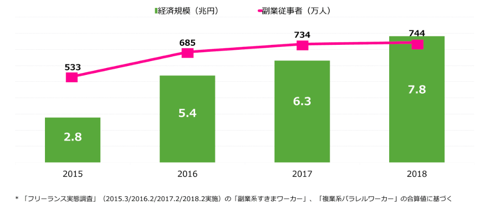 上記はランサーズ株式会社が発表した、フリーランス実態調査2018年のデータです。市場規模は8兆円近くになり、その規模はどんどん拡大しています。