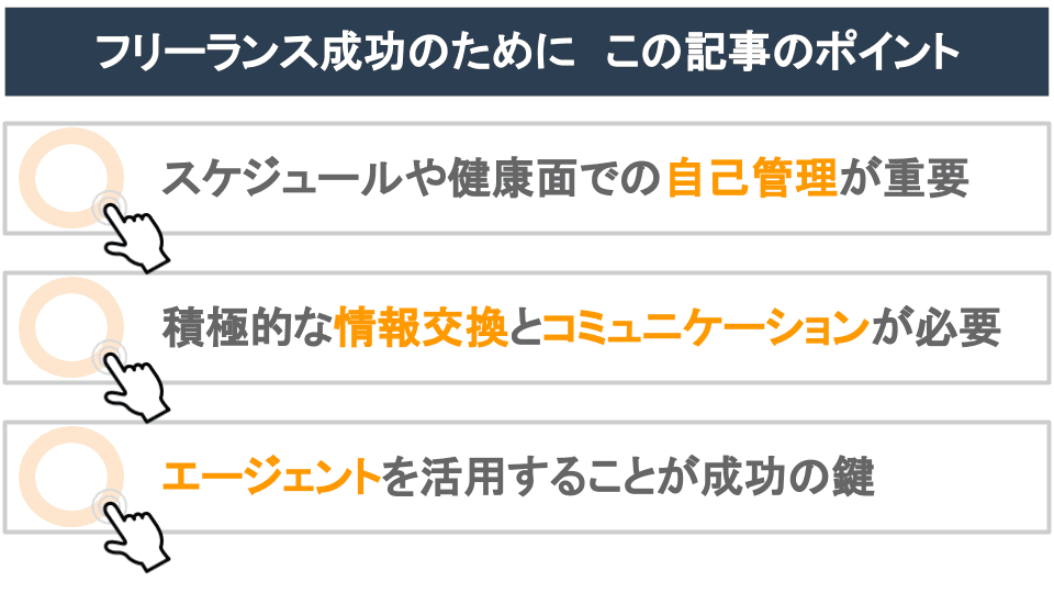腹を割って問題点や自分の理想を話せるエージェントと、長期で良好な関係を築くことも、フリーランスとして成功するための必要ノウハウと言えます。