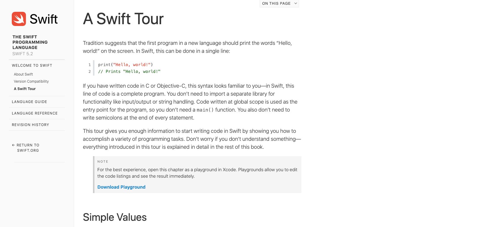 A Swift TourはAppleが提供している公式チュートリアル(英語)です。Swiftの最新バージョンに対応したガイドラインになっており、コードを書きながら学ぶことができます。プログラミング経験があり、Swiftが初めてという人向けです。