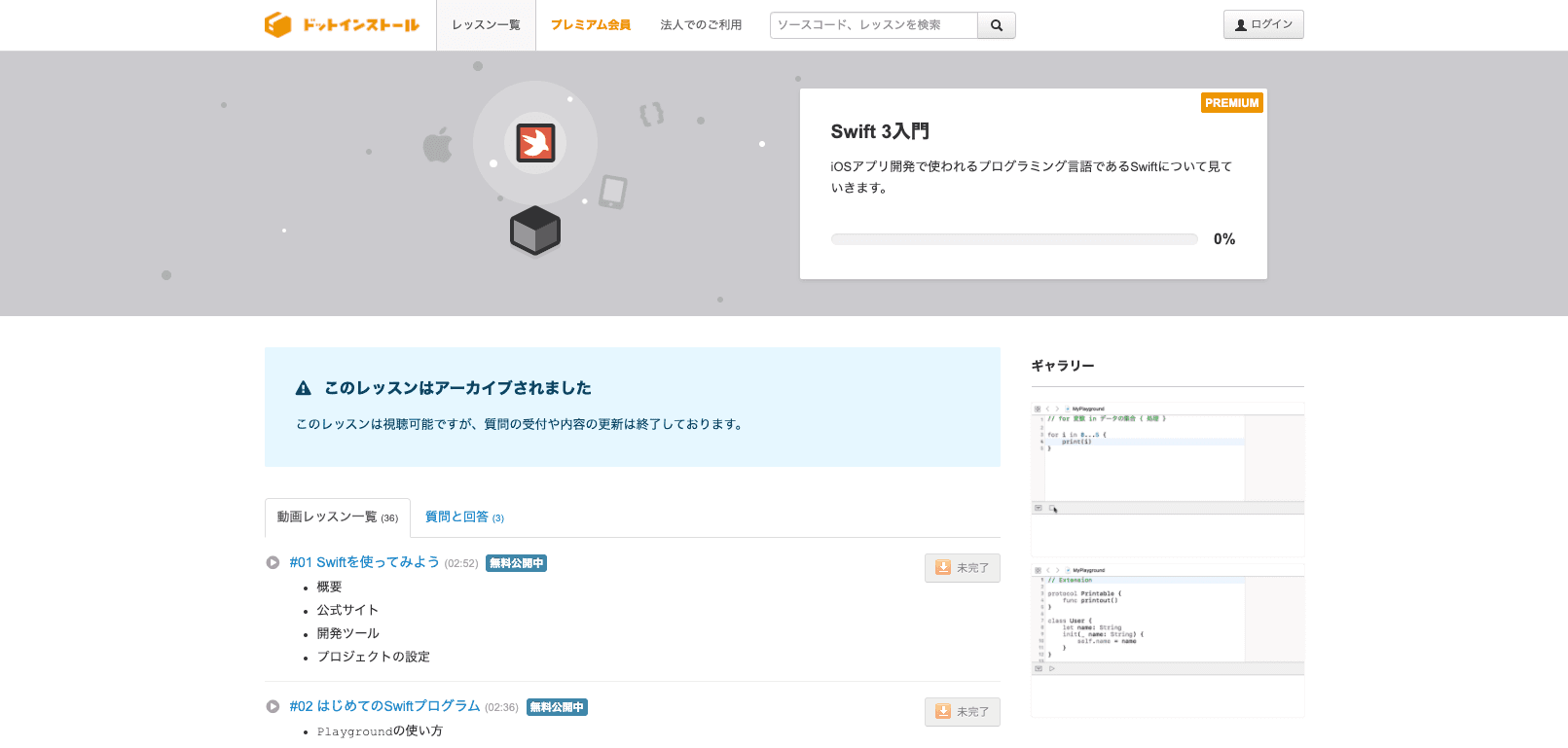3分程度の短い動画を繰り返し視聴することでプログラミングノウハウが身につくドットインストール。Swift講座は、有料コース含め全36コースがあり、無料コースでは概要から基本的なデータの型やデータの演算について学ぶことができます。