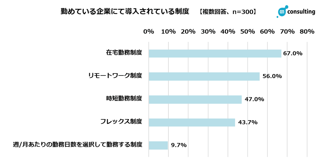 お勤めの企業で導入されている制度について聞いたところ、「在宅勤務制度」が67.0%、「リモートワーク制度」が56.0%でした。新型コロナウイルス感染症の影響によって在宅勤務やリモートワークが普及しましたが、一方で徐々に社員に出社を要求する企業も増えてきている中、半数以上の企業では場所を選ばない自由な働き方ができる制度を導入しているようです。勤務時間においてもフレキシブルに働けるよう「時短勤務制度」を導入している企業が47.0%、「フレックス制度」43.7%と4割以上の企業が柔軟性を持った制度を導入しています。