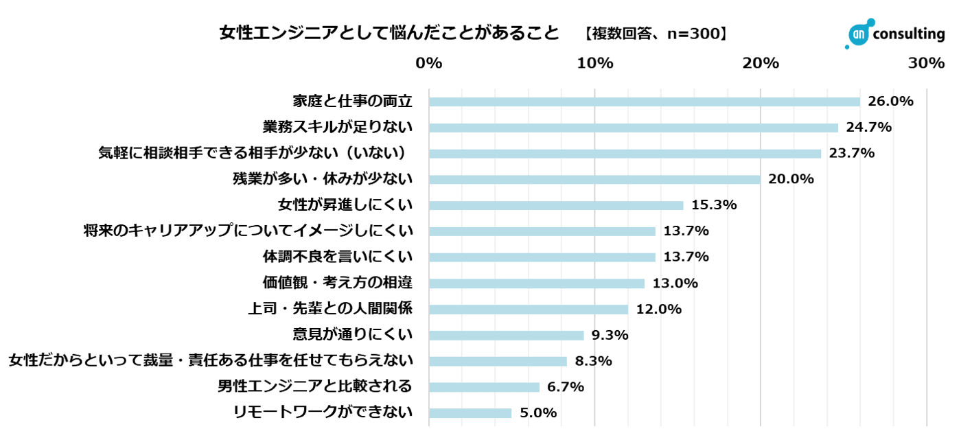 Q8. あなたが女性エンジニアとして悩んだことがあることをお答えください。(複数回答、n=300)また、苦労したエピソードをお答えください。(自由回答、n=300)