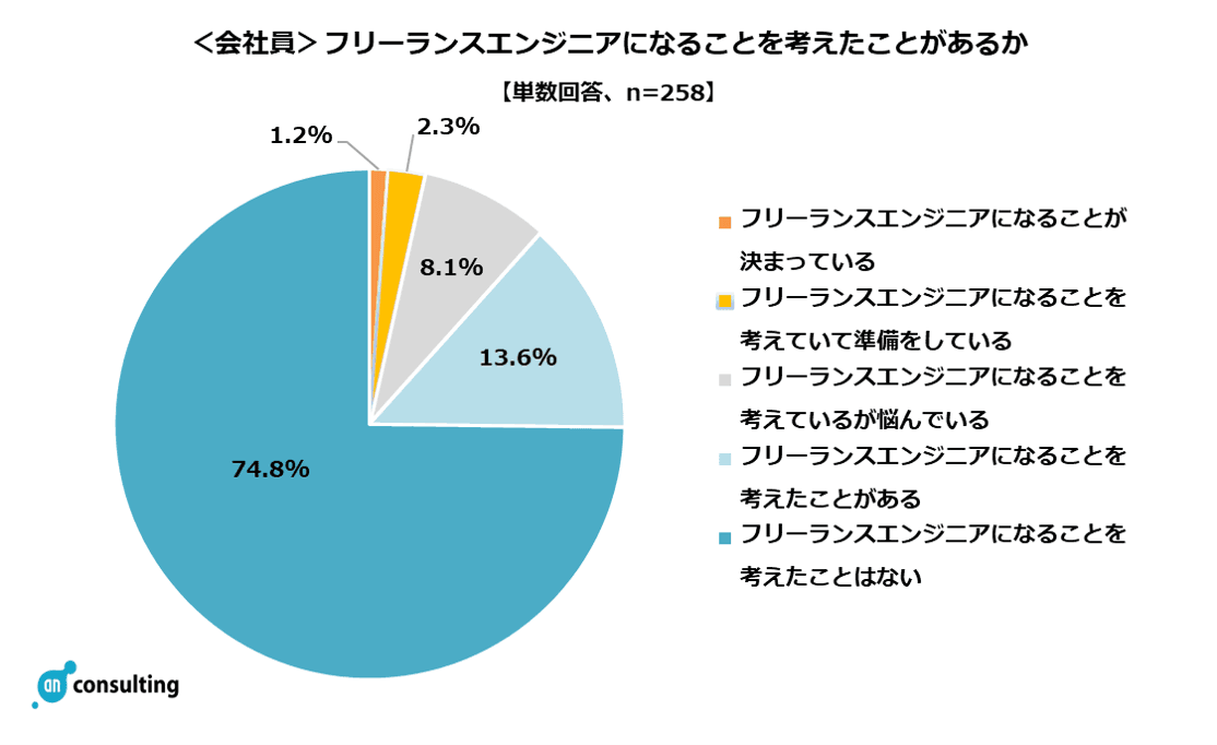 フリーランスへの転向、25.2%と約4人に1人がフリーランスになることについて考えていたことが明らかに。(「フリーランスになることが決まっている」1.2%、「フリーランスエンジニアになることを考えていて準備をしている」2.3%、「フリーランスエンジニアになることを考えているが悩んでいる」8.1%)