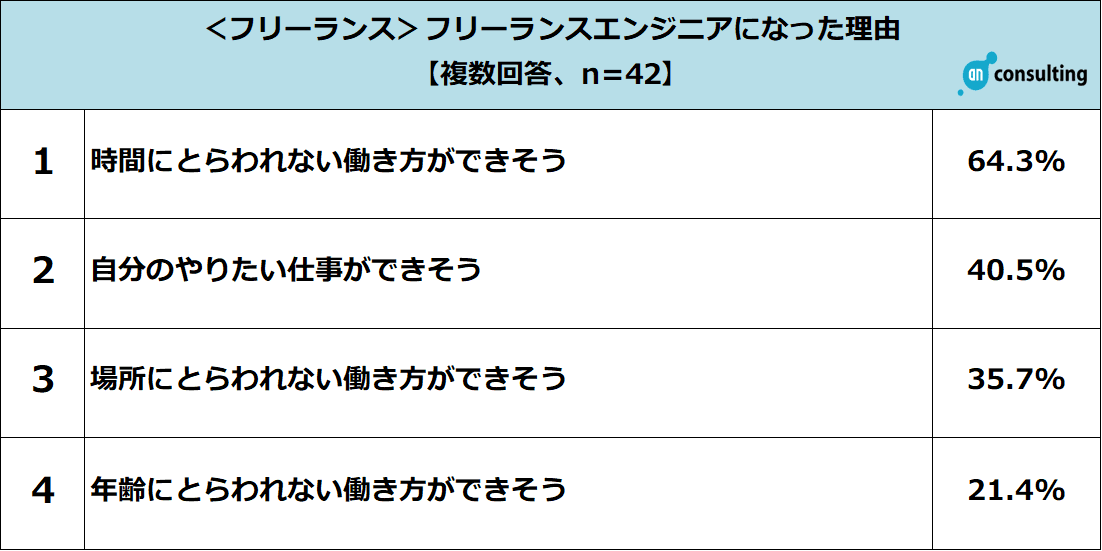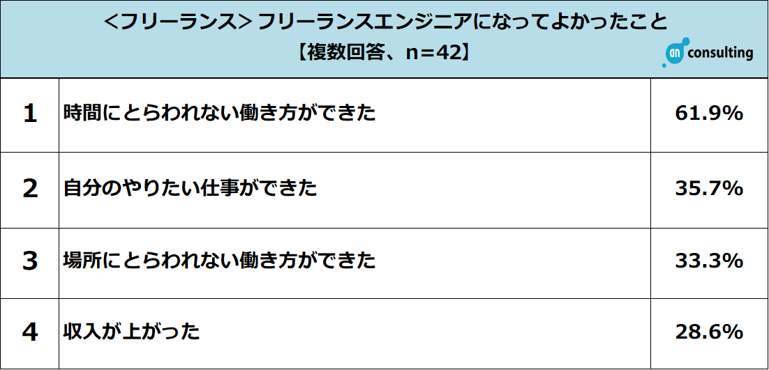 フリーランスエンジニアとして活躍している方に、フリーランスになった理由を聞いたところ、「時間にとらわれない働き方ができそう」が64.3%、「自分のやりたい仕事ができそう」が40.5%、「場所にとらわれない働き方ができそう」が35.7%でした。また、フリーランスになってよかったことを聞いたところ、「時間にとらわれない働き方ができた」が61.9%、「自分のやりたい仕事ができた」が35.7%、「場所にとらわれない働き方ができた」が33.3%と約3人に1人がフリーランスエンジニアになった理由であげられていた理想の働き方を叶えていることがわかりました。