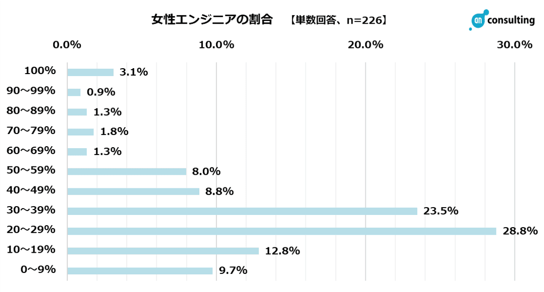 女性エンジニアの割合は「20~29%」が28.8%、「30~39%」が23.5%。