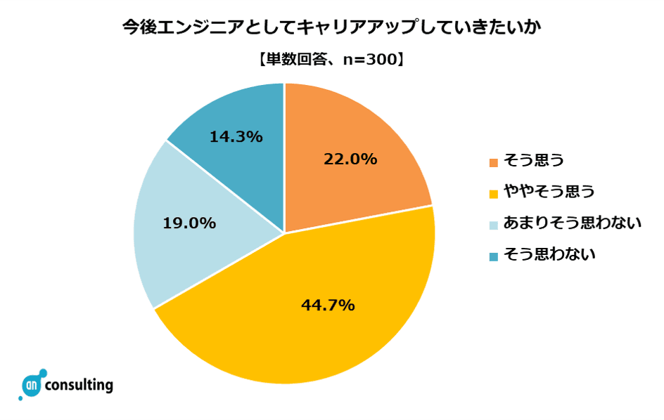エンジニアとしてキャリアアップをしていきたい人の割合は「そう思う」22.0%、「ややそう思う」44.7%。あわせて66.7%の方がキャリアアップを考えていることが判明。