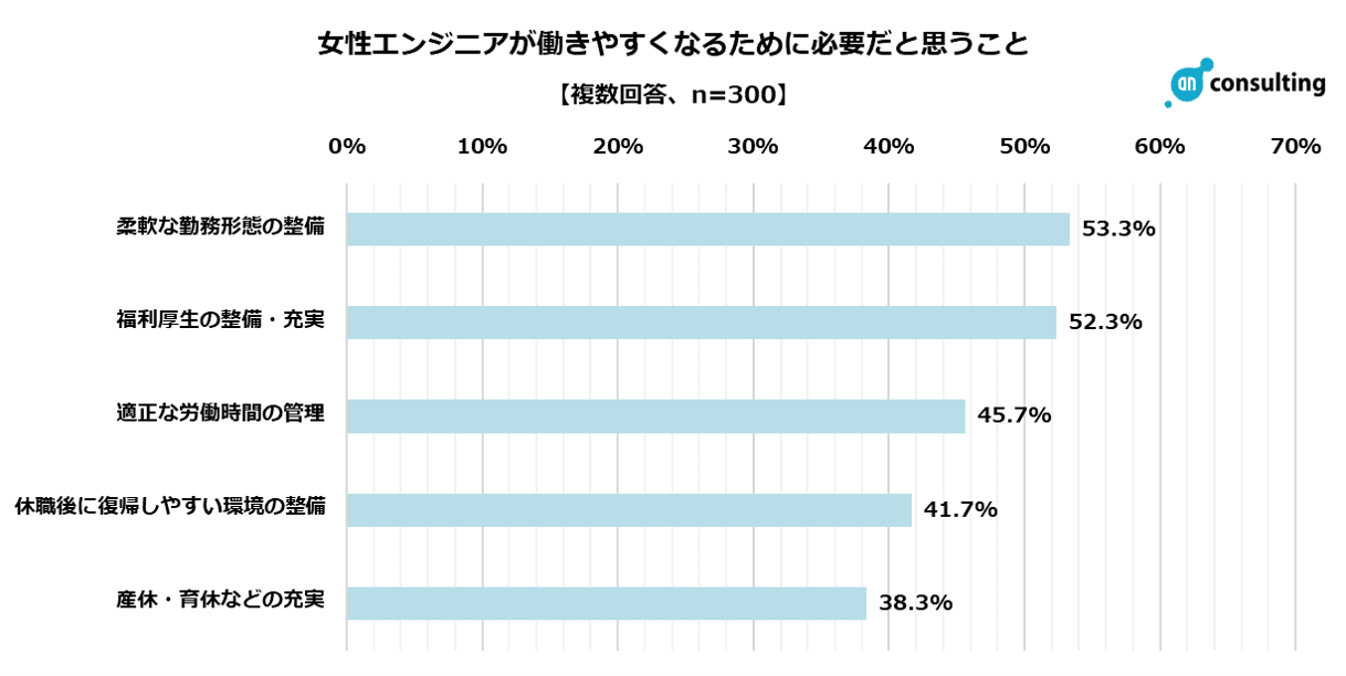 女性エンジニアとして悩んだことがあることを聞いたところ、「家庭と仕事の両立」が26.0%、「業務スキルが足りない」が24.7%、「気軽に相談できる相手が少ない(いない)」が23.7%、「残業が多い、休みが少ない」が20.0%でした。苦労したエピソードを聞いたところ、「女性の体調面に関する連絡や相談ができなかった」「結婚、出産と変化があるごとに退社に追い込まれた」「出産と昇進のタイミングが同じだと、昇進できない」という意見がありました。悩んだことがあること、苦労したエピソードともに女性ならではの身体の不調や家庭との両立という面に悩んだ経験がある方が多いようです。また、Q1「企業における女性エンジニアの割合」20%台が最多、Q2「女性エンジニアの役職の割合」2割という結果が明らかになりましたが、エンジニアという職種において女性の数を増やし、さらに女性管理職も増やしていくことで、出産・育児についての理解促進に繋げられるかもしれません。