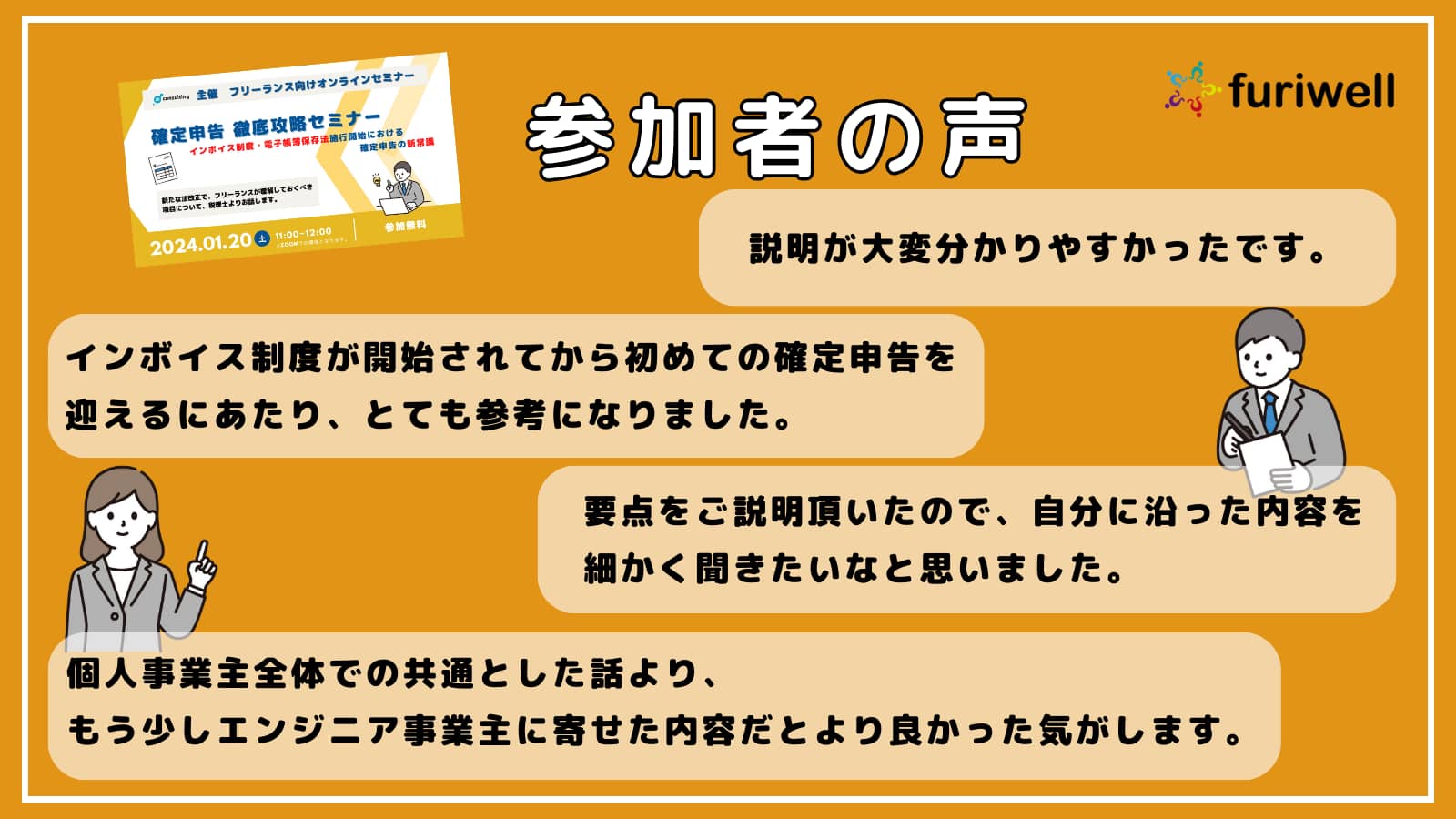この度は、弊社主催セミナー「徹底攻略!インボイス制度・電子帳簿保存法施行における確定申告の新常識」にご参加いただき、ありがとうございました。 「新たな法改正に伴い、注意すべきポイントや変更点などをフリーランスの皆さまに知っていただきたい」という思いから企画をした本セミナーでしたが、いかがでしたでしょうか。 今回は、多くのフリーランスの方に届けたいという思いから、あくまでも汎用的な話を中心としたセミナー内容とさせていただきました。 本日のお話をきっかけに、より自分ごととしてお考えいただく第一歩となっていましたら、とても嬉しく思います。 確定申告や税務面について、より詳しく話を聞きたい!という方は、フリエン登録者様限定でfuriwell(フリエン登録者限定福利厚生サービス)にて提携している税理士法人のご紹介も可能でございますので、お気軽にお問い合わせください。 今後も、フリーランスの皆さまが安心して働くことができる環境を整えてまいります。
