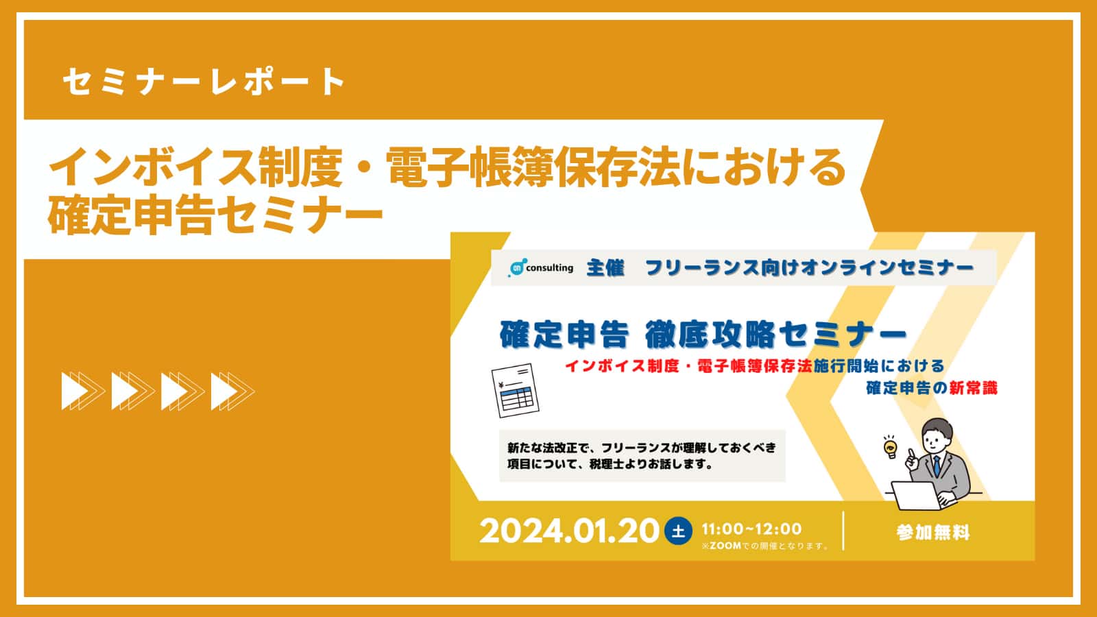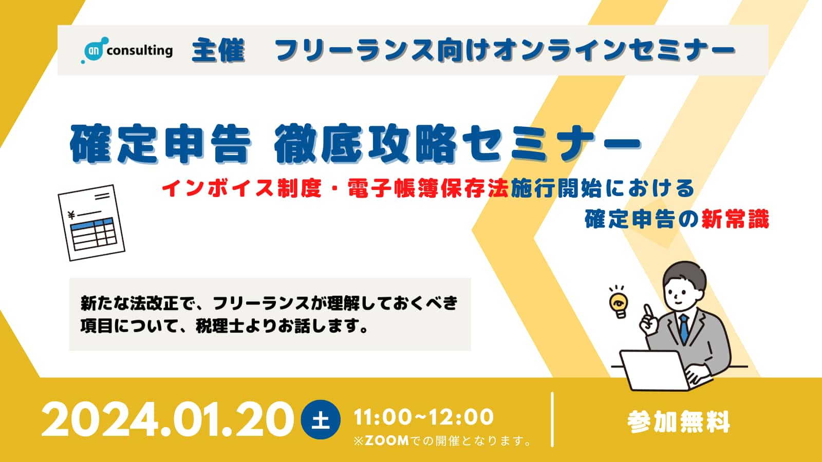 2024年1月20日(土)11:00~フリーランスエンジニア向けのオンラインセミナー「徹底攻略!インボイス制度・電子帳簿保存法施行における確定申告の新常識」を開催しました。