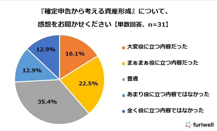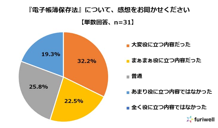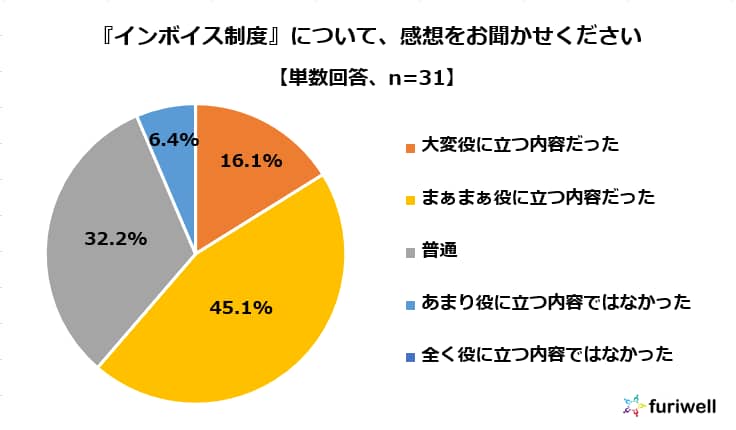 セミナー終了後、満足度に関するアンケートを行いました。 『インボイス制度』『電子帳簿保存法』に関しては、それぞれ「大変役に立つ内容だった」「まぁまぁ役に立つ内容だった」を合わせて50%以上の方に満足いただけました。 また、参加者の皆さまからは、「説明が大変分かりやすかったです。」「インボイス制度が開始されてから初めての確定申告を迎えるにあたり、とても参考になりました。」というお声から、「要点をご説明頂いたので、自分に沿った内容を細かく聞きたいなと思いました。」「個人事業主全体での共通とした話より、もう少しエンジニア事業主に寄せた内容だとより良かった気がします。」など貴重なお声もいただきました。
