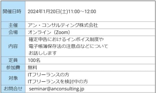 \ 1月20日(土)開催 / 徹底攻略!インボイス制度・電子帳簿保存法施行における確定申告の新常識