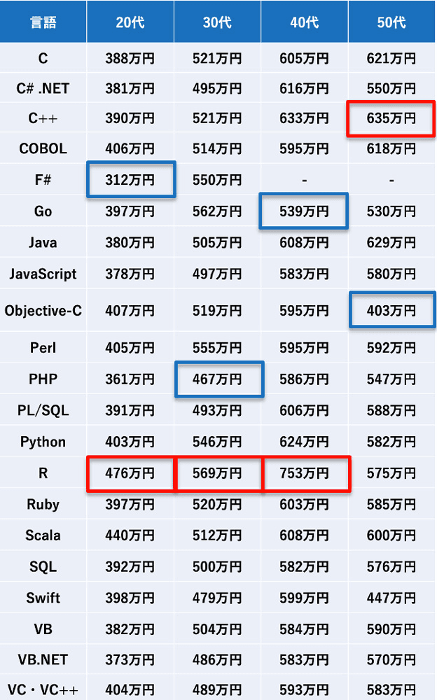 高収入を得たいと考える際に、まず先に思い浮かぶのは「高単価となりやすい言語を学ぶ」ことではないでしょうか。パーソルキャリアの調査「2020年プログラミング言語別年収ランキング」によると、平均年収が高い言語はR、Scala、Pythonとなっています。