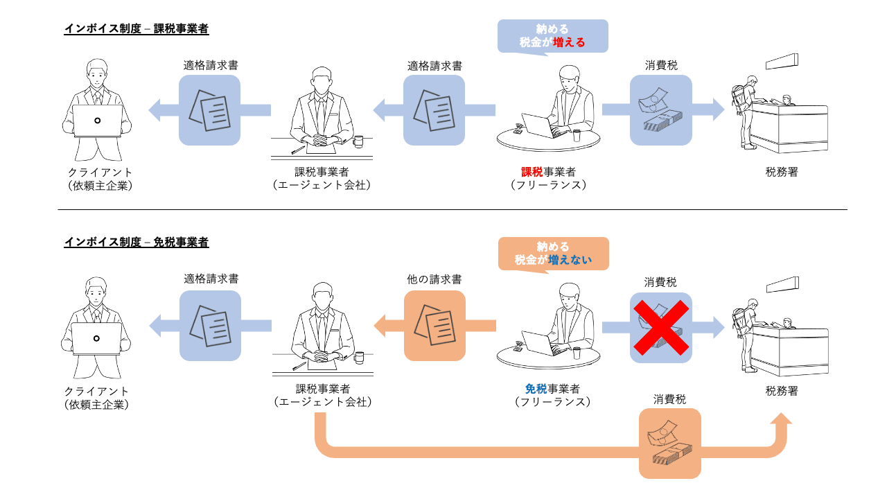 では、インボイス制度によって課税事業者となるフリーランスには、免税事業者であるフリーランスの方と比べ、どのような影響が出るのでしょうか。懸念される影響は2つあります。