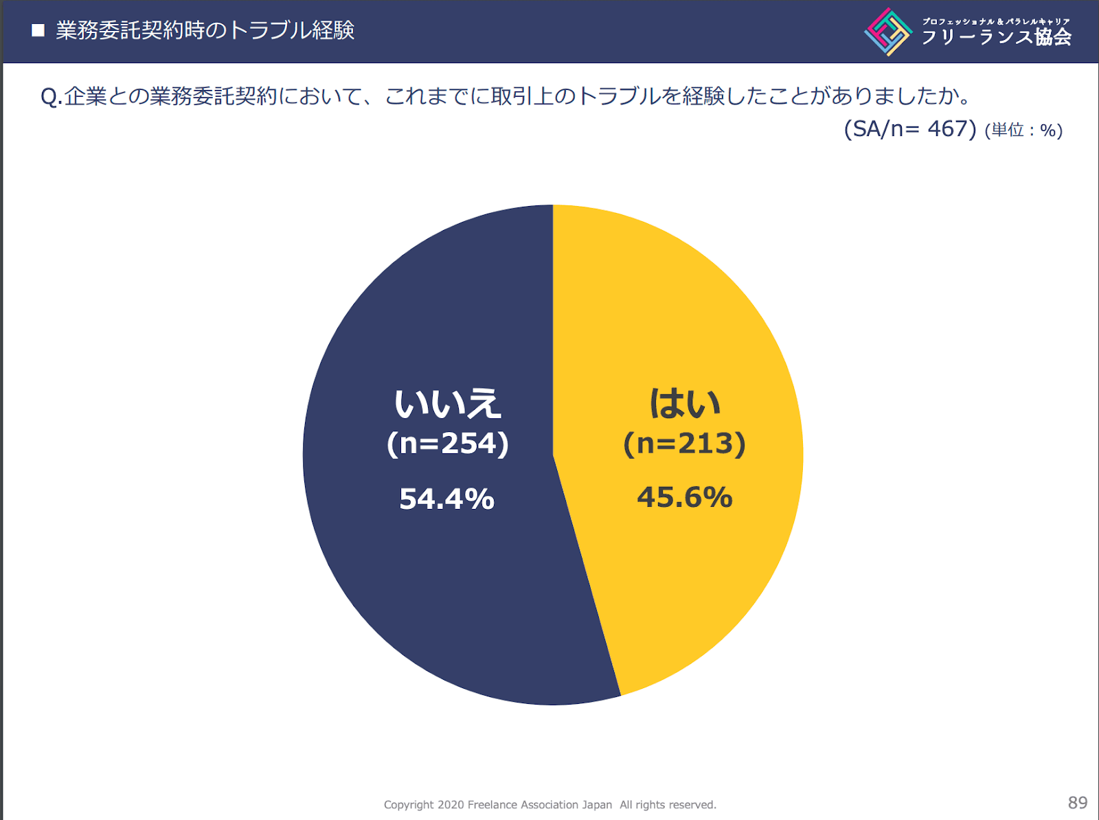 「契約を口頭でしてしまった」などのリスク管理の甘さから、フリーランスの2人に1人が「トラブルを経験したことがある」と回答しています。直接企業との契約をする場合には、紹介などが多くなりがちです。すると、つい油断して口頭で契約してしまい後日トラブルとなったケースで、我々は何度もご相談を受けています。