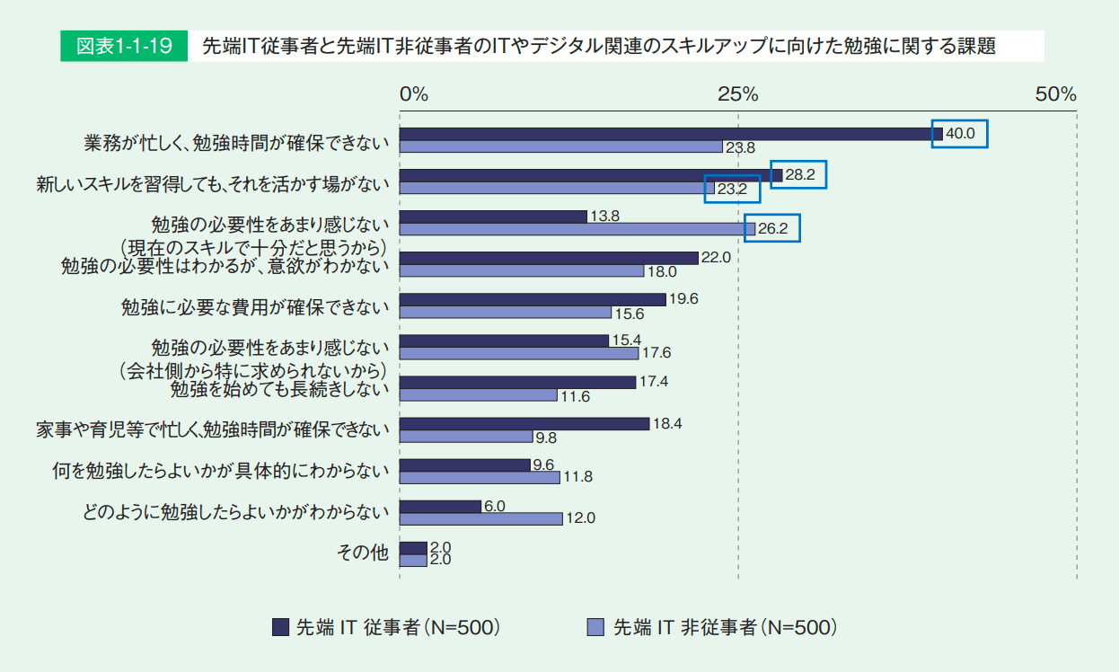 しかし、「IT人材白書2020」 の調査結果によると、デジタル関連のスキルアップに向けた勉強に関する課題の中では「業務が忙しいために勉強時間が確保できない」との回答が最も多い結果でした。