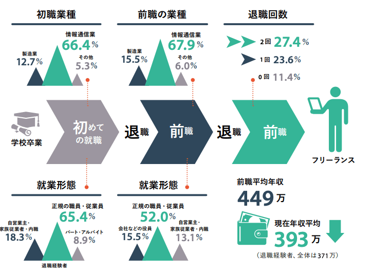 またフリーランスエンジニアになる人の初職(新卒で入った業種)は、情報通信業が66.4%、製造業が12.7%を占めています。