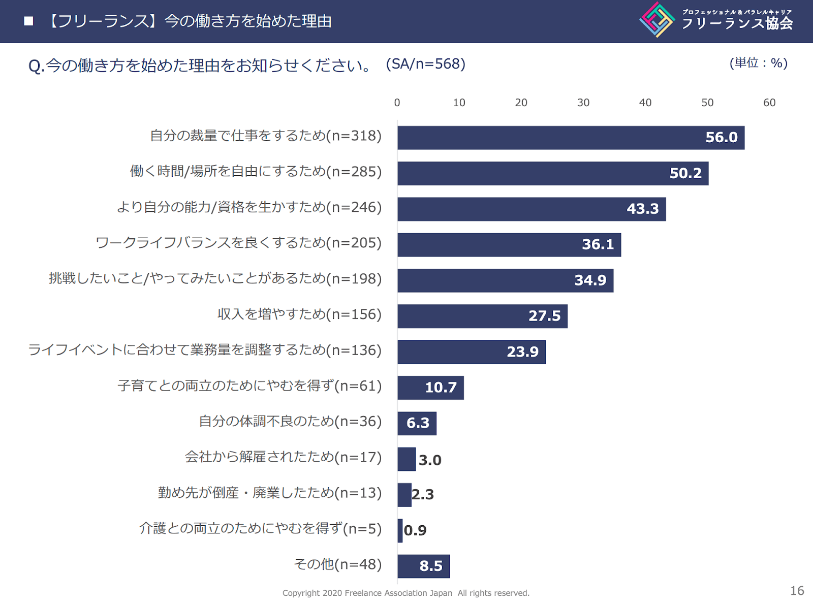 「フリーランス白書2020」のデータによると、フリーランスとして働き始めた方の半数以上が「自分の裁量で仕事がしたい」という理由で始めたり、その他にも「働く時間や場所を自由にしたい」「収入を増やしたい」という理由からフリーランスを志す方が多くなっています。