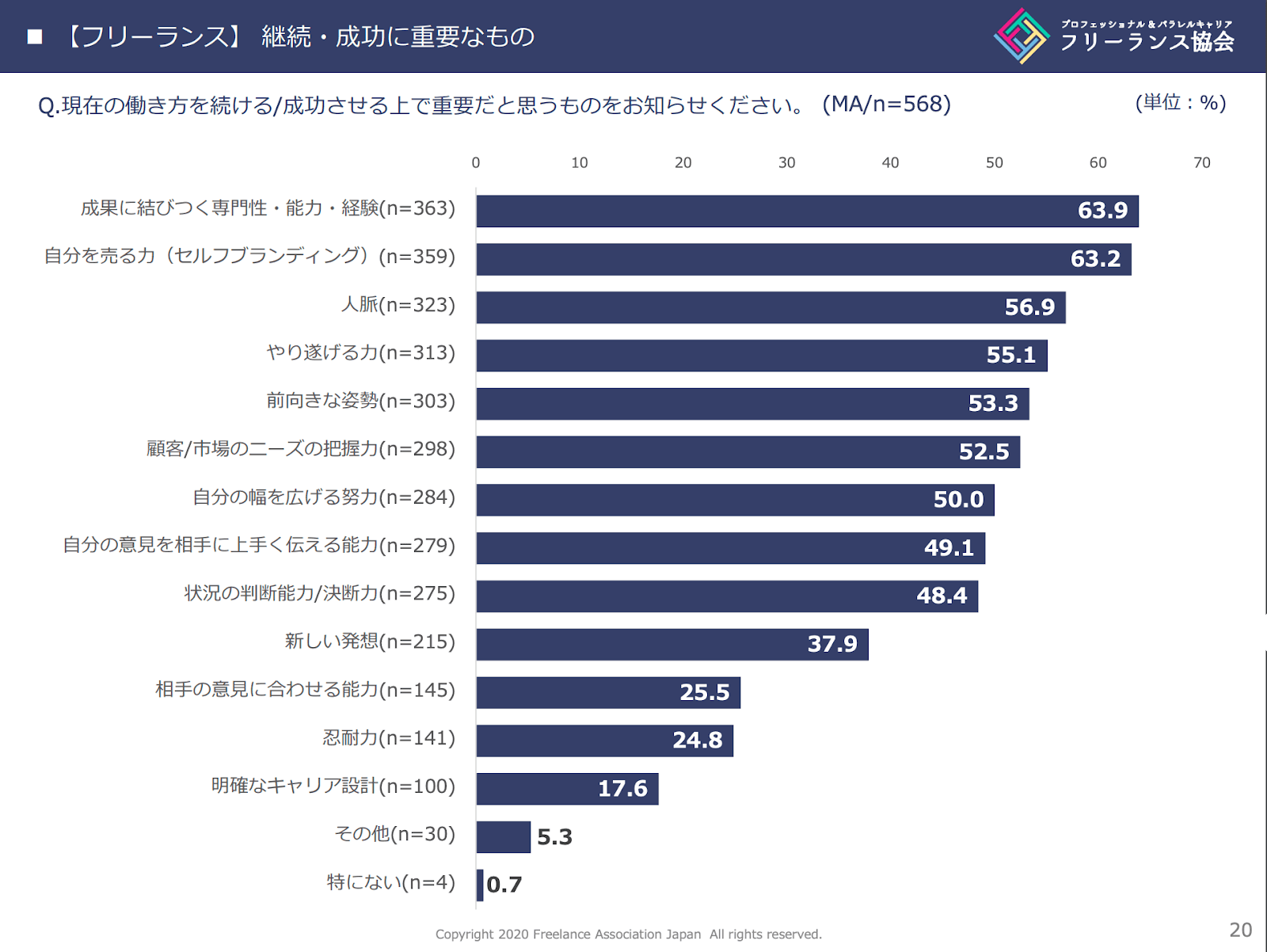 「フリーランス白書2020」のデータによれば、現在の働き方を成功させる上での重要なこととは何かという質問に対し、「成果に結びつく専門性・能力・経験」と答えた方が最も多くいたという結果が出ています。