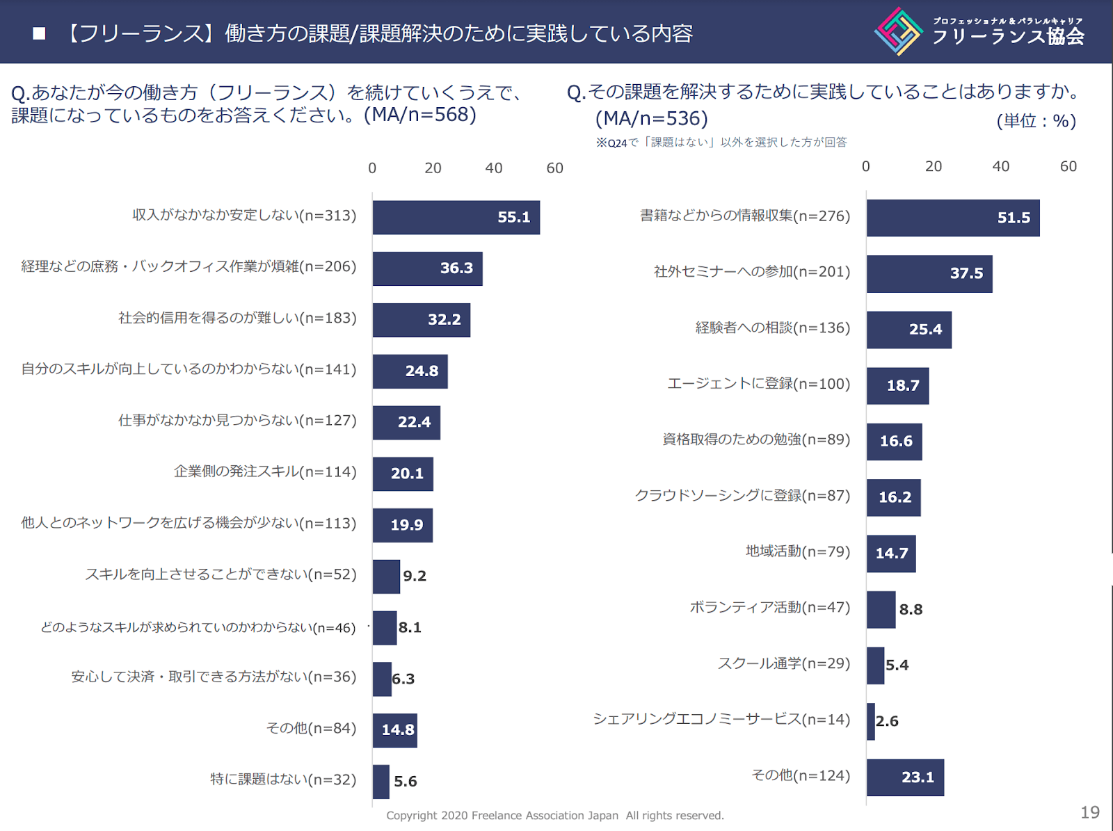 「フリーランス白書2020」のデータによると、フリーランスとして働く上で最も課題になることは「収入の不安定さ」となっています。