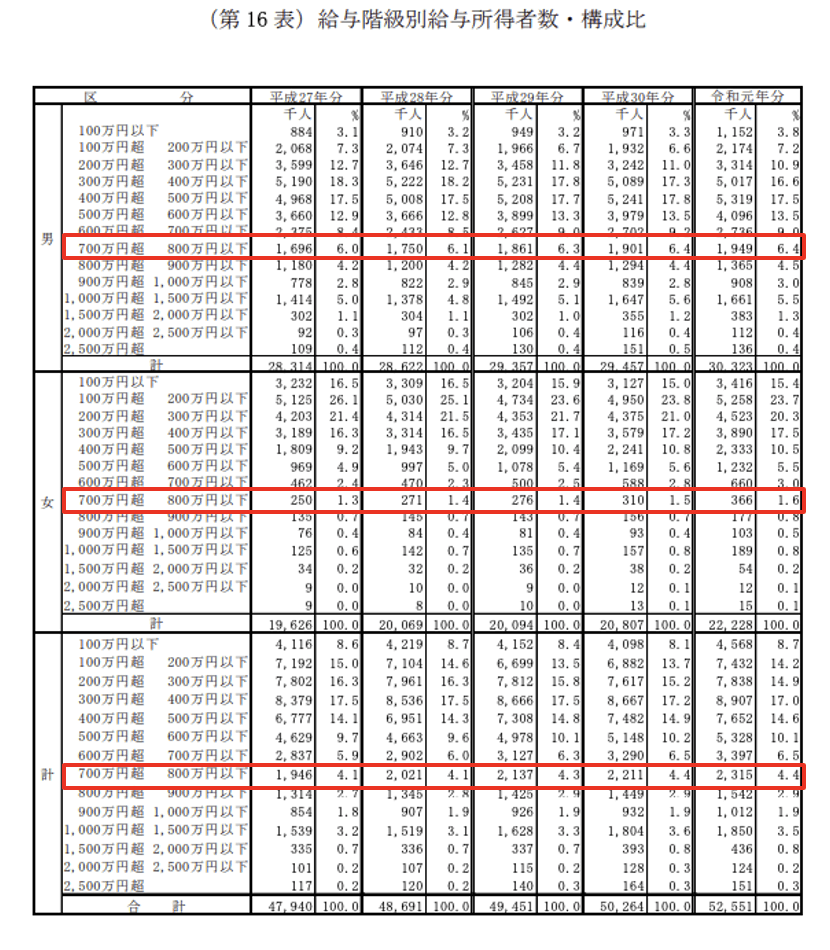 上のデータだけを眺めるとソフトウェア・インターネット関連技術従事者の年収は日本の平均年収よりも低く見えたかと思いますが、高年収になる確率で考えたらフリーランスエンジニアは非常に魅力的なのです。ちなみに国税庁が行なっている、民間給与実態統計調査の給与階級別給与所得者数・構成比を見てみると、全国民のうち、平均年収が700万円を超える割合は全体の4%に留まります。それを鑑みると、フリーランスエンジニアは高年収を目指しやすい職業といえるのではないでしょうか?