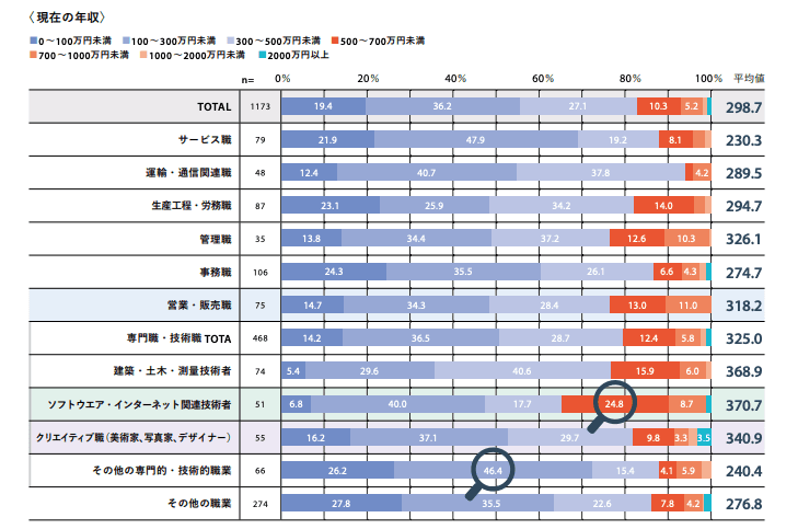 しかし、リクルートワークス研究所発表による別のデータを見てみると、ソフトウェア・インターネット関連技術者の約30%以上は年収500万円、更に約10%の方が年収700万円を超えているのです。