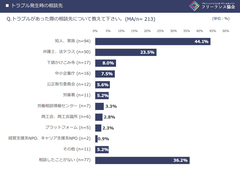しかしフリーランス白書2020によるとトラブル発生時に、誰にも相談したことがないと回答した方は36%、知人や家族に相談する方は44.1%です。そして弁護士に相談する方は23.5%と非常に少ないのが現状なのです。