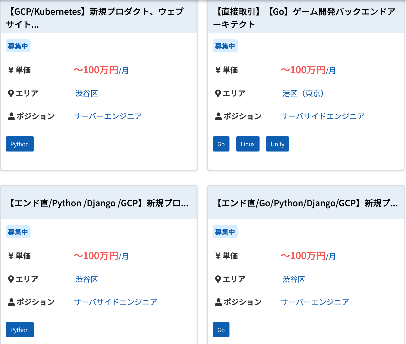 上記でランクインしていた3つの言語、「R」「Scala」「Python」を検索したところ、60万円〜100万円ほどの案件が多く、中には120万円を超える高単価案件もありました。