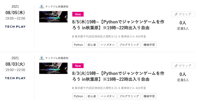 具体例をあげるとTECH PLAYで掲載されている「Pythonでジャンケンゲームを作ろう」など、仕事とは別に楽しめるセミナーもあります。