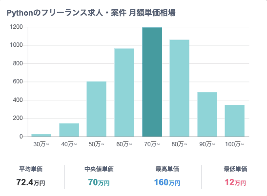 Python案件の月額単価相場は60~80万円とされています。Pythonのフリーランス案件月額単価相場のグラフで確認するとPythonの最高月額単価が160万円、Pythonの最低月額単価が12万円です。