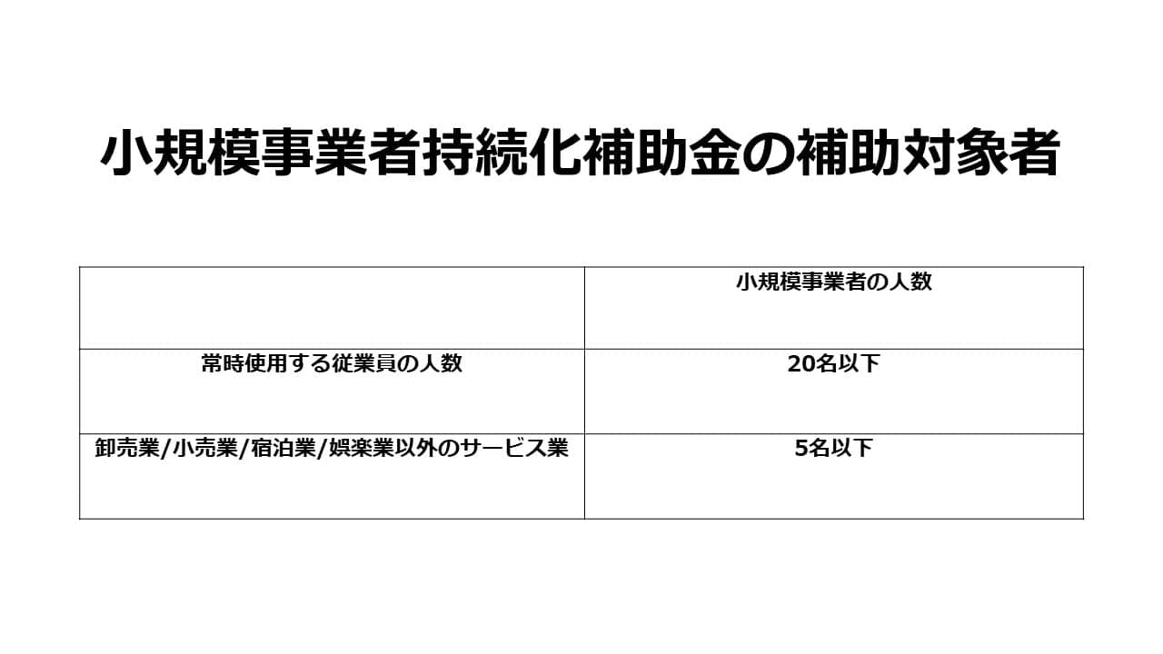 日本の小規模事業者のうち、常時使用する従業員の数が20名以下の事業者(ただし、卸売業・小売業・宿泊業と娯楽業以外のサービス業であれば5名以下)が補助対象者となります。